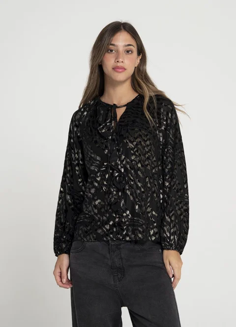 Blusa tul print con dorado , manga larga con elastico en puño y volado en escote.