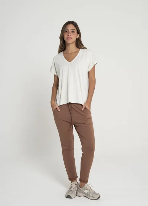 Remera jersey spandex escote V con tajito y dobladillo en manga.