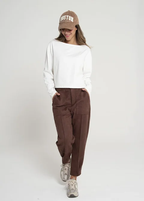 Remera manga larga hombros caidos con tajito lateral, nabgas holgadas.