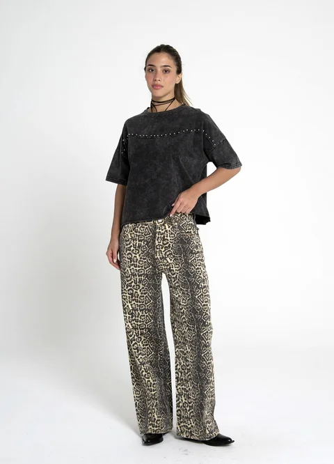 Remera pre lavada con una delicada hilera de tachas aplicadas sobre una costura que cruza el pecho y las mangas, corte oversize con hombros caídos y mangas cortas amplias, terminacionde ruedo con un acabado al corte.