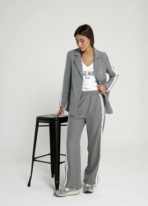 Saco sastrero con botones en contraste. Dos bolsillos delanteros de estilo plaque y detalle lateral en mangas intervenidas con una doble tira lateral en contraste.