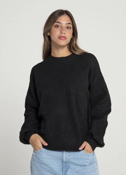 Sweater tejido con detalle de bordado al tono en relieve sobre el delantero y mangas, cuello redondo con terminaciones en ríb.